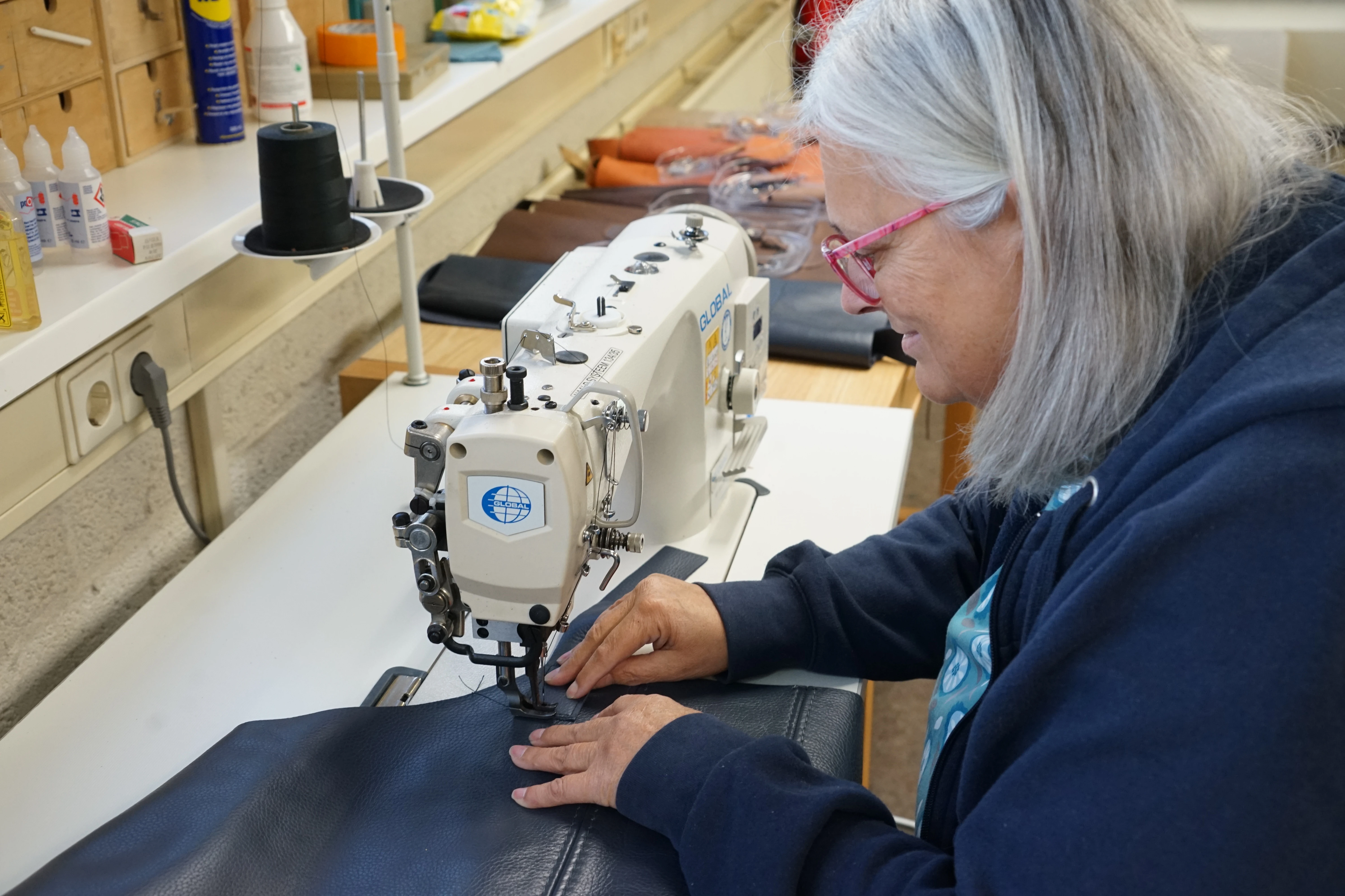 In ons naaiatelier worden functionele kunstwerkjes gemaakt: het leer van bankstellen wordt omgetoverd tot BBQ schorten, dekbedden tot hondenkussens en oude jeans tot shoppers.